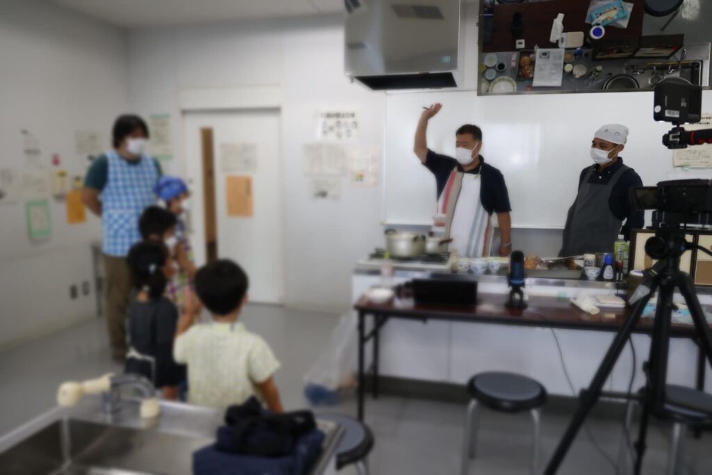 桜木公民館調理室から配信、オンラインでスクール生のパパたちを繋ぎ、ご自宅のキッチンで家族で食べるランチを作って頂く企画。
