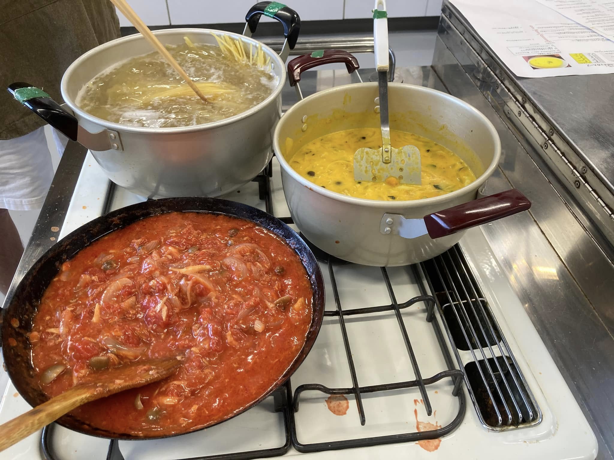 メニューは、トマトパスタとカボチャスープ。途中まで工程は一緒でいっぺんに作れて、そして色々アレンジ出来るようになっています。